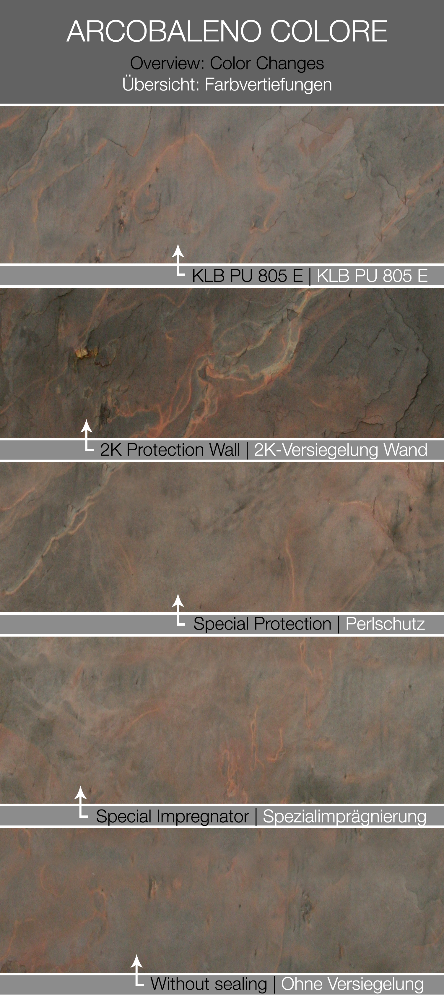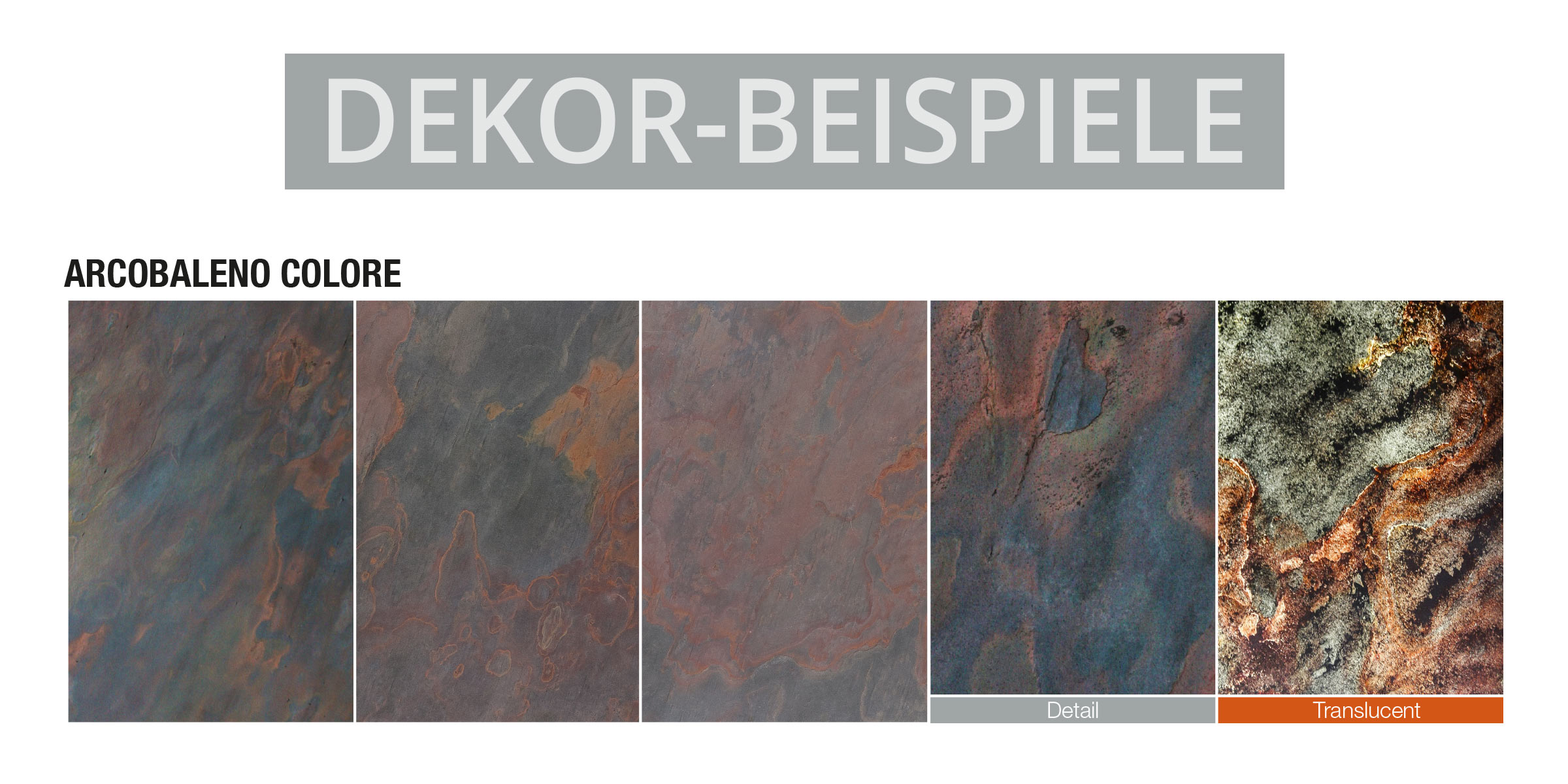 Arcobaleno Colore Luma ist das absolute Designelement, die lichtdurchlässigen Steine verwandelnden jeden Raum in ein einzigartiges Erlebnis der Sinne. Arcobaleno Colore Luma hat dieselben Eigenschaften wie das Classic Material, bis auf die Lichtdurchlässigkeit. Wird das Leuchtmittel hinter dem Arcobaleno Colore Luma ausgeschaltet, wirkt es wie gewöhnlicher Schiefer, wird die Lichtquelle eingeschaltet entstehen einzigartige Musterungen.