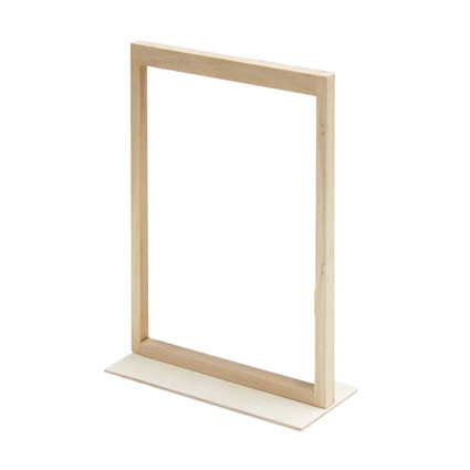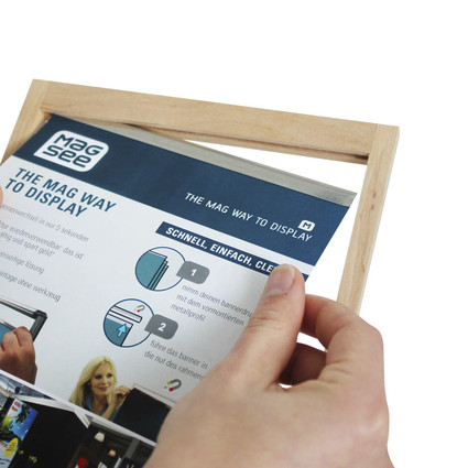 Handlicher Tischaufsteller aus Holz für doppelseitige Poster in A5 mit Magnettechnik myMago.