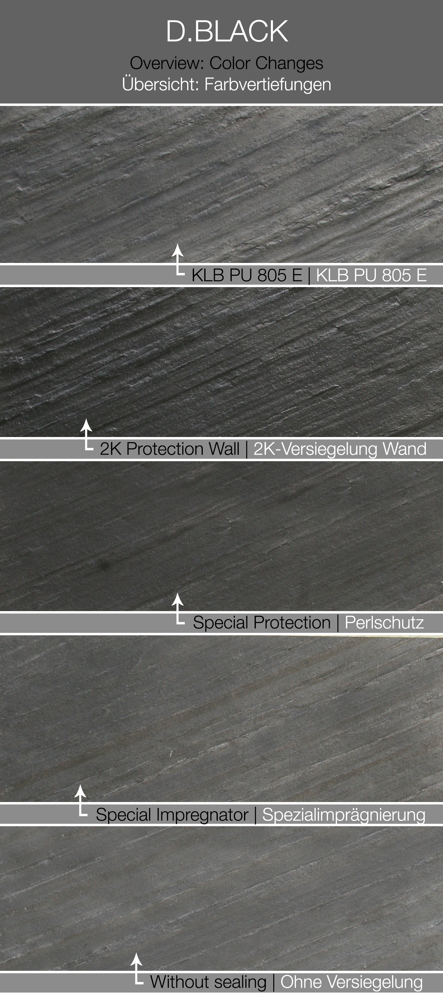 D.Black ist ein Glimmerschieferdekor mit einer echten Steinoberfläche. Der besondere Glimmereffekt entsteht durch einen erhöhten Anteil an Feldspat. Insgesamt ist die Oberfläche härter und weist eine stärkere Struktur auf, somit eignet sich dieses Material besonders für Wände als auch für Fußböden. Meistens bleibt der Glimmerschiefer sehr farbstabil in der Maserung der Oberfläche.