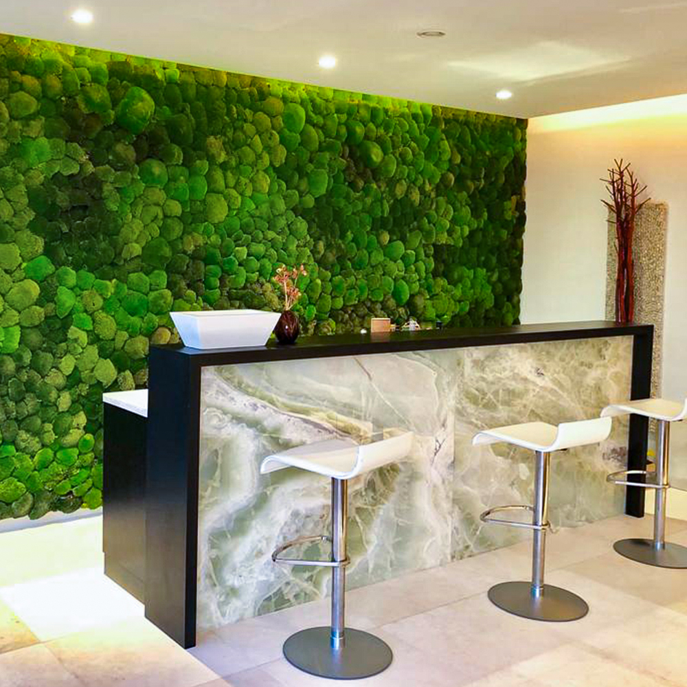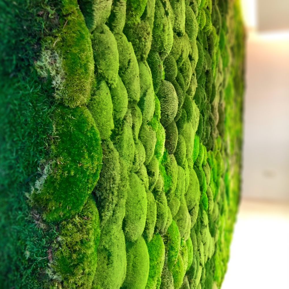 Gestaltungen mit echten natürlichen Materialien in Lebensräumen ermöglichen uns den physischen Kontakt mit der Natur. Laut wissenschaftlichen Studien wirken die natürliche Strahlkraft und Energie des Waldes, die auch dem konservierten Moos noch innewohnen, positiv auf das Wohlbefinden, stärken die Konzentration und bescheren mehr innere Ruhe. Herzschlag und Blutdruck sinken merkbar und nachweislich. Messbar sind auch die schallabsorbierenden Eigenschaften einer Mooswand, welche zur Optimierung der Raumakustik beitragen.