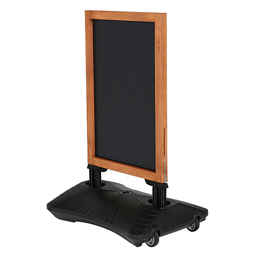 Dieser robuste Kundenstopper mit schwarzer Metalltafel und Holzrahmen. Der Fuß ist aus Kunststoff und kann mit Wasser oder Sand befüllt werden. Rostgeschützte Federn sorgen für Stabilität bei Wind.