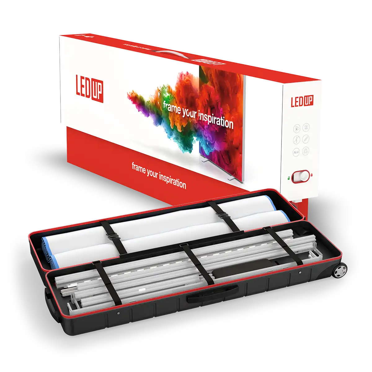 Federleicht und LeuchtstarkHohe Leuchtkraft und gleichmäßige Ausleuchtung machen LEDUP zum Champion unter den Leuchtdisplays. Hochwertige OSRAM LED Technik rückt Ihre Botschaft ins richtige Licht. Setzen Sie einzelne Akzente oder kombinieren Sie mehrere Elemente zu großflächigen Lichtwänden. Schaffen Sie auch in großen Räumen raffinierte Stimmungen. Werkzeugloser AufbauDurch ein äußerst innovatives Stecksystem ist der Aufbau in kürzester Zeit vollzogen. Die einzelnen Systemteile der praktischen Transportbox entnehmen, werkzeuglos zusammenstecken und die Stoffpaneele einspannen – fertig. hochwertiges eloxiertes Aluminium in 2 Höhen verfügbar (200 und 245cm) in 2 Breiten verfügbar (85 bzw. 100cm) OSRAM LED Technik Werkzeugloser Aufbau Technische Daten LedUp LedUp 85x200Profiltiefe 8 cm - Leistungsaufnahme 59 W - Osram LEDs LedUp 85x245Profiltiefe 8 cm - Leistungsaufnahme 77 W - Osram LEDs LedUp 100x200Profiltiefe 8 cm - Leistungsaufnahme 59 W - Osram LEDs LedUp 100x245Profiltiefe 8 cm - Leistungsaufnahme 77 W - Osram LEDs Technische Daten Verpackung KartonverpackungGewicht: 2,8 kg - Maße (BxTxH): 28x11x115cm ABS Transportkoffer mit Räder und GriffGewicht: 4,1 kg - Maße (BxTxH): 32x15x118cm